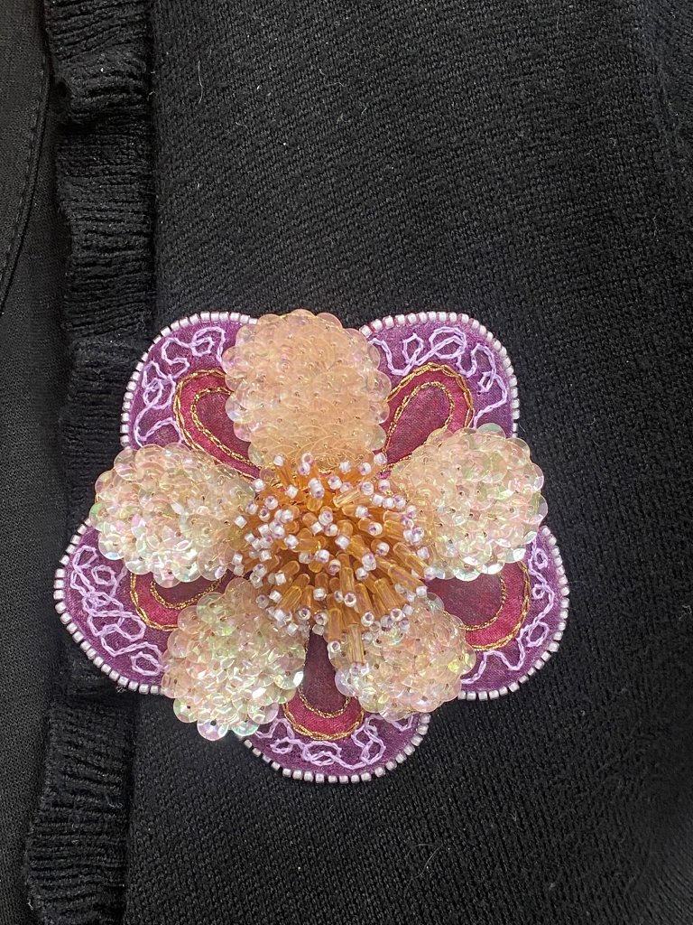 Kennd verður ný pallíettu aðferð, blandað vermicelli, þrívídd og frágangur með straujárni. Pallíettu aðferðin er góður undirbúningur fyrir Soie Ovale. Verkefnið er blóm sem hægt er að sauma á veski/flík eða nota í nælu. Vermicelli bikarblöð, pallíettu krónublöð og glerperlu frævlar. Mismunandi litasamsetningar í boði og val um sykuraðferð, háan handsaum eða miðháan handsaum í frævla.