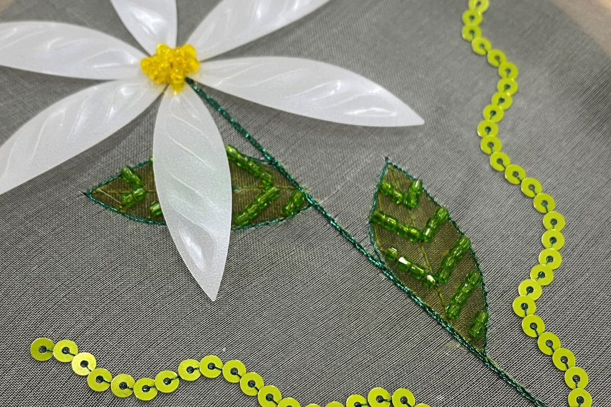 Kennt verður að skipta um átt, sauma beinar línur, ferning og hring. Unnið með franskar og ítalskar pallíettur, litlar og langar glerperlur. Einnig verður notast við Fil A Gant og útsaumstvinna.