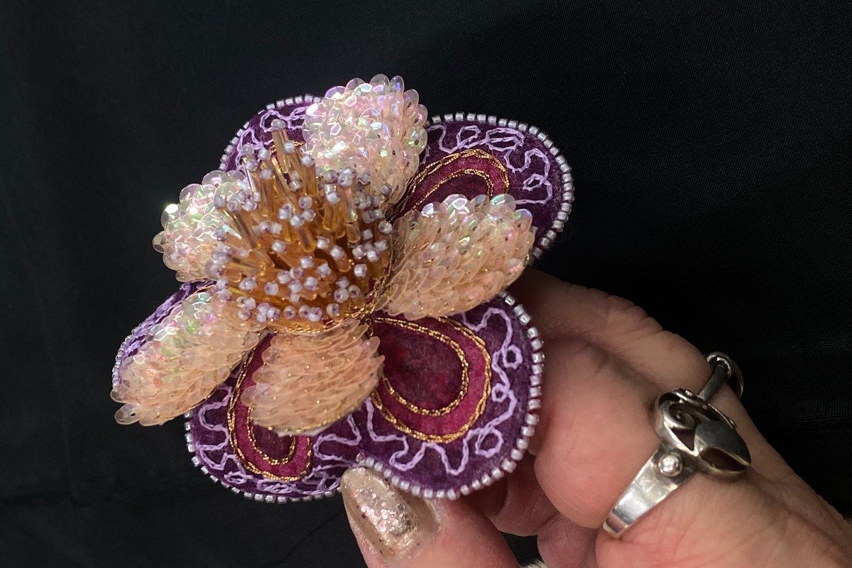 Kennd verður ný pallíettu aðferð, blandað vermicelli, þrívídd og frágangur með straujárni. Pallíettu aðferðin er góður undirbúningur fyrir Soie Ovale. Verkefnið er blóm sem hægt er að sauma á veski/flík eða nota í nælu. Vermicelli bikarblöð, pallíettu krónublöð og glerperlu frævlar. Mismunandi litasamsetningar í boði og val um sykuraðferð, háan handsaum eða miðháan handsaum í frævla.